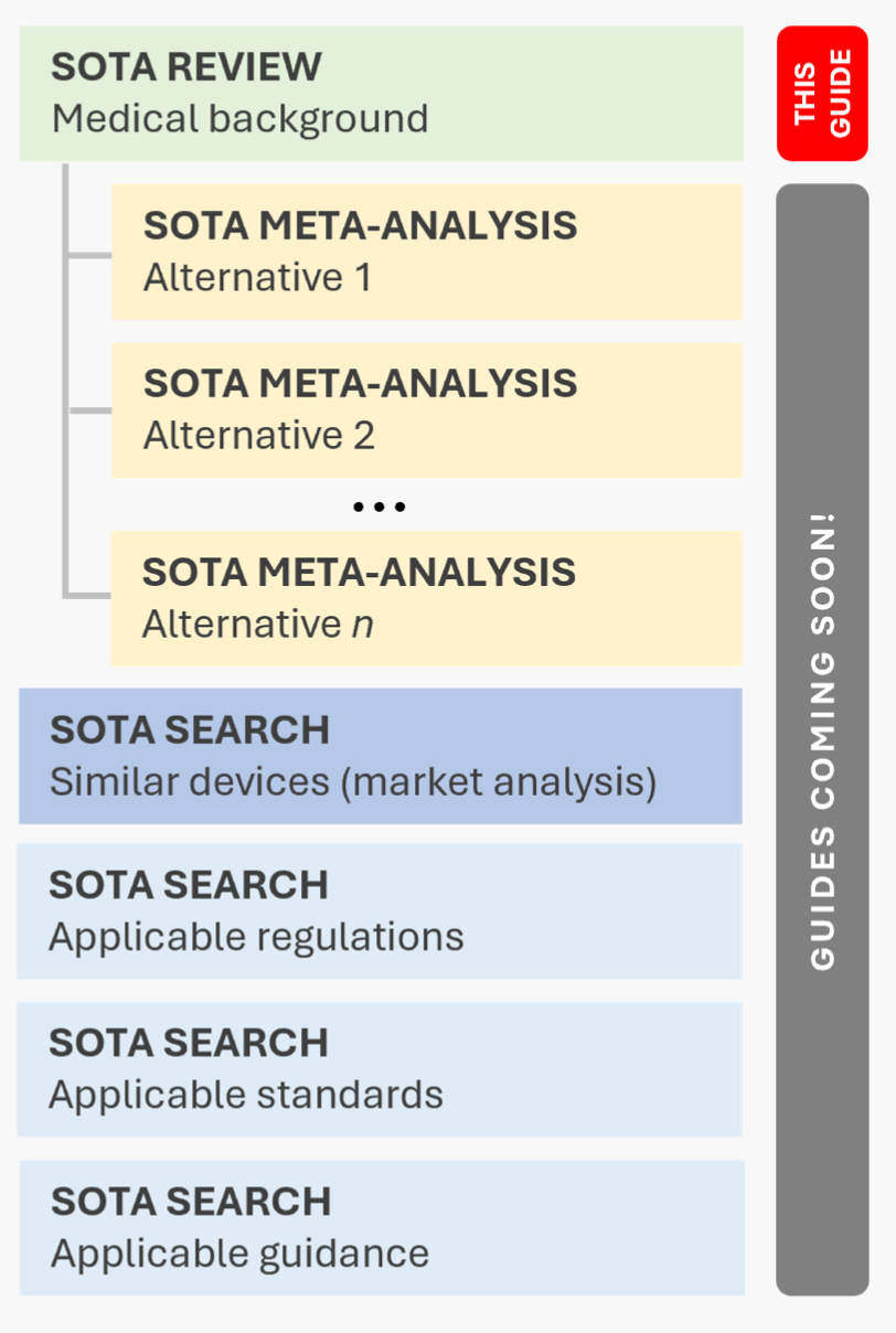 First, most SOTA activities are not merely literature searches. Instead, they take the form of systematic reviews, meta-analyses, or umbrella reviews (see Box 1 for an explanation of these terms). This means that SOTA analyses go beyond simply retrieving literature—they involve a structured synthesis, either textual or numerical. Second, a SOTA analysis is not a single, monolithic process. The analysis begins with a systematic review to establish the medical background (the focus of this document). This review is the topic of this document. The analysis then proceeds with meta-analyses to evaluate the performance and safety of medical alternatives (a dedicated guide on this will follow soon), which typically provides the criteria for the acceptance of benefit and performance in the clinical evaluation. Additionally, SOTA analyses extend beyond clinical evidence, and include the identification of medical devices, applicable regulations, standards, and guidance. We will address these additional searches and reviews in the upcoming articles.